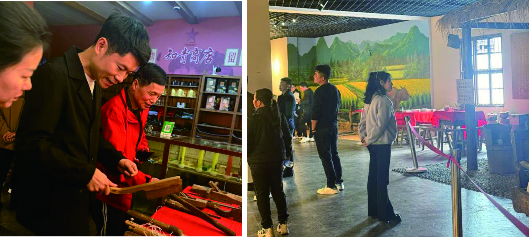 我们首站抵达靖安知青小镇。漫步在充满年代感的街道上,映入眼帘的是那组栩栩如生的“知青时代雕塑”。那些扛着锄头、捧着书本、眺望着远方的身影,瞬间将我们拉回到那个激情燃烧的岁月。随后参观的知青博物馆,更是一场深刻的精神洗礼。一件件斑驳的劳动工具,一本本泛黄的日记,无声诉说着当年知识青年“上山下乡、艰苦奋斗”的故事。在场的我们,在这一刻仿佛都读懂了一个道理:无论在哪个年代,幸福都是奋斗出来的。
